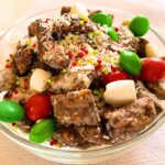 Add some colored sprinkles, red and green M and M's onto the mixture, and stir till the candies are evenly distributed in the cereal chocolatey mixture.